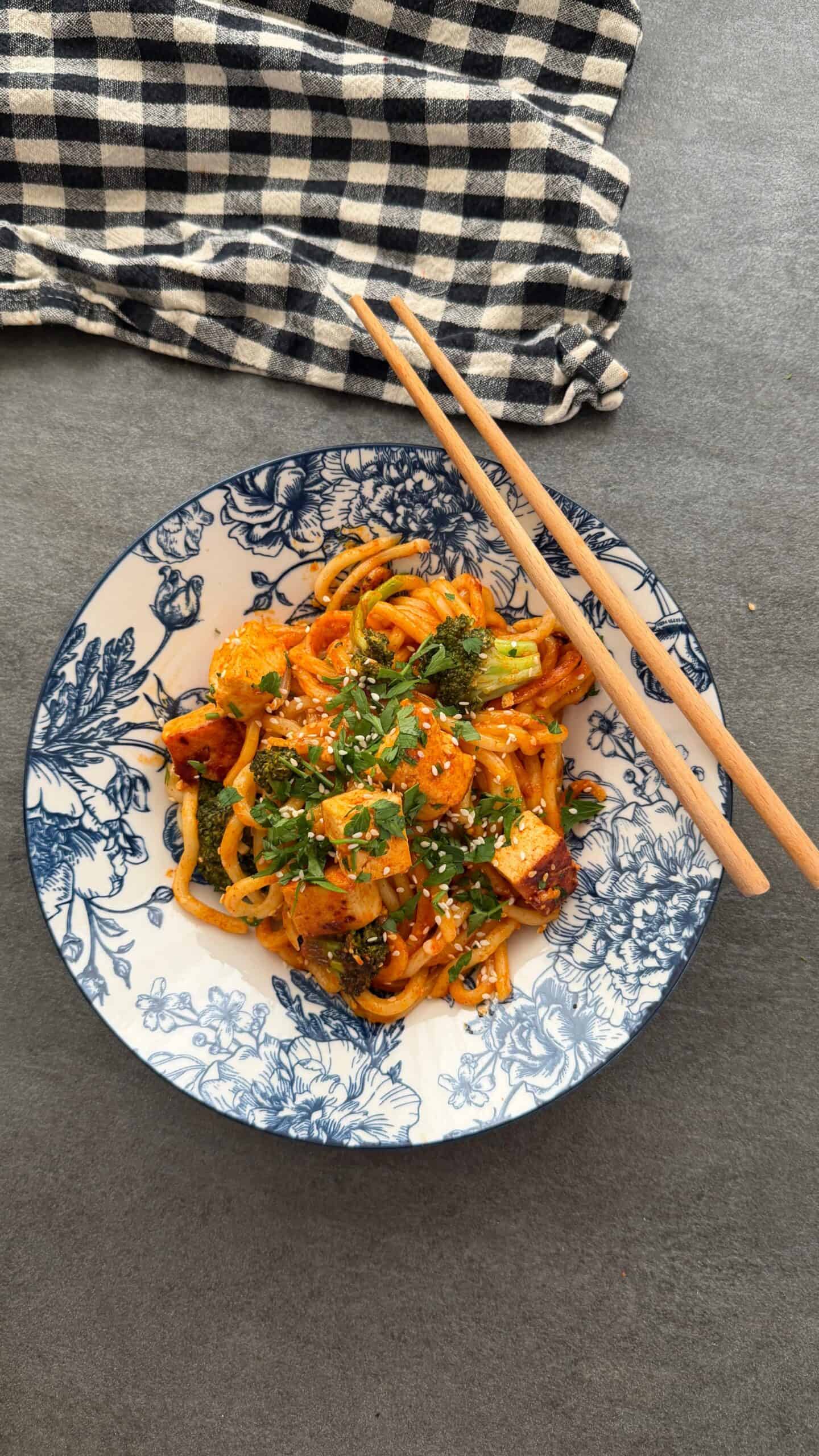מערבבים את הטופו עם פפריקה מתוקה, שום, דבש, רוטב הויסטר ומלח. מטגנים את הטופו בשמן זית עד שהוא מתקרמל עם הרוטב. מוסיפים את האטריות והברוקולי המבושלים ומקפיצים הכל יחד עד שהרוטב מתאחד. במידת הצורך מוסיפים מעט מים ומתקנים תיבול. מגישים עם פטרוזיליה קצוצה ושומשום.